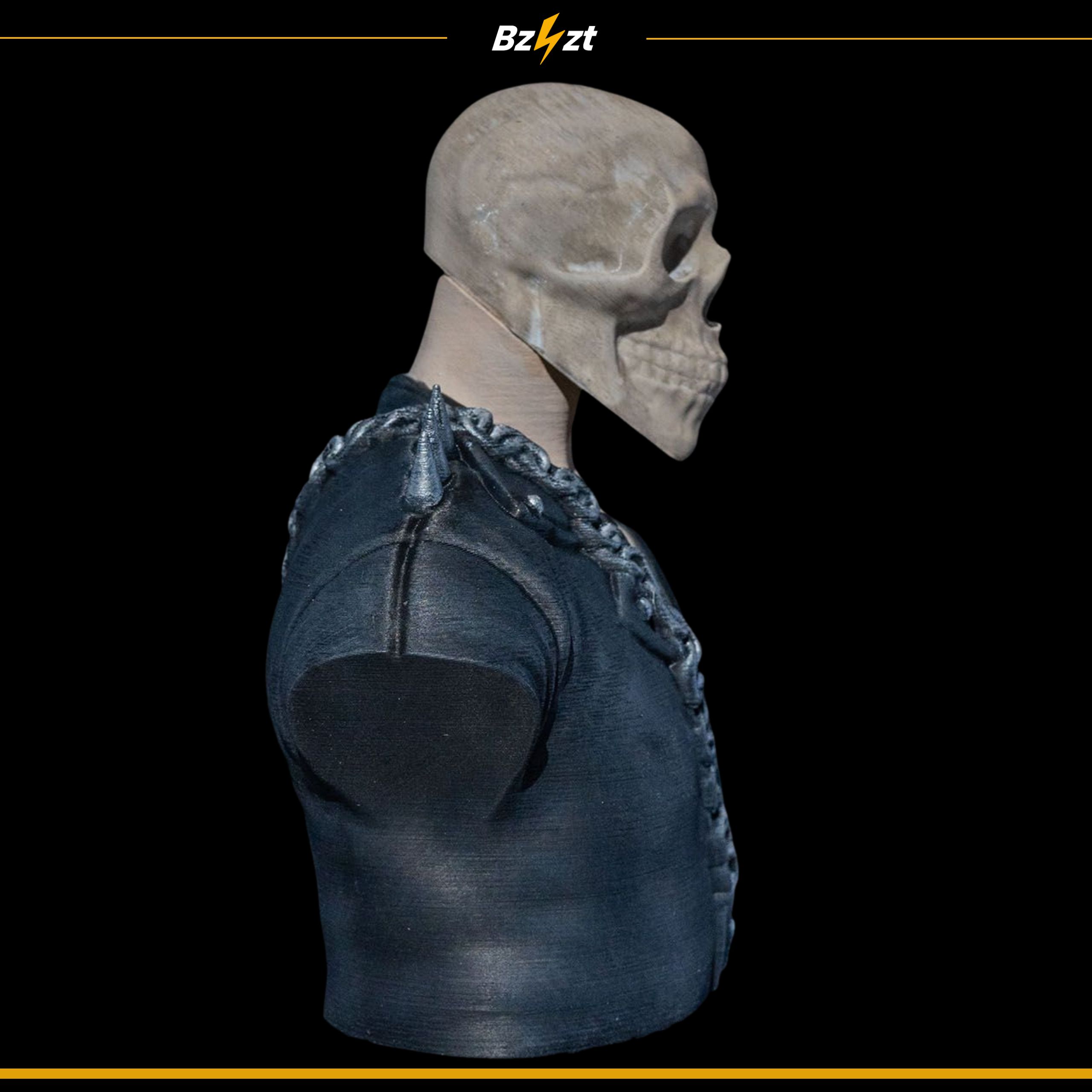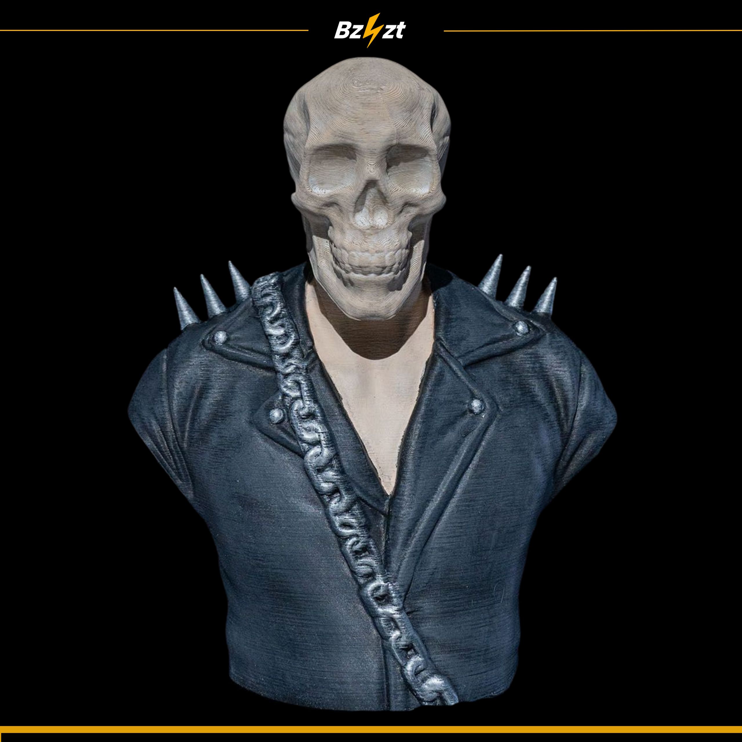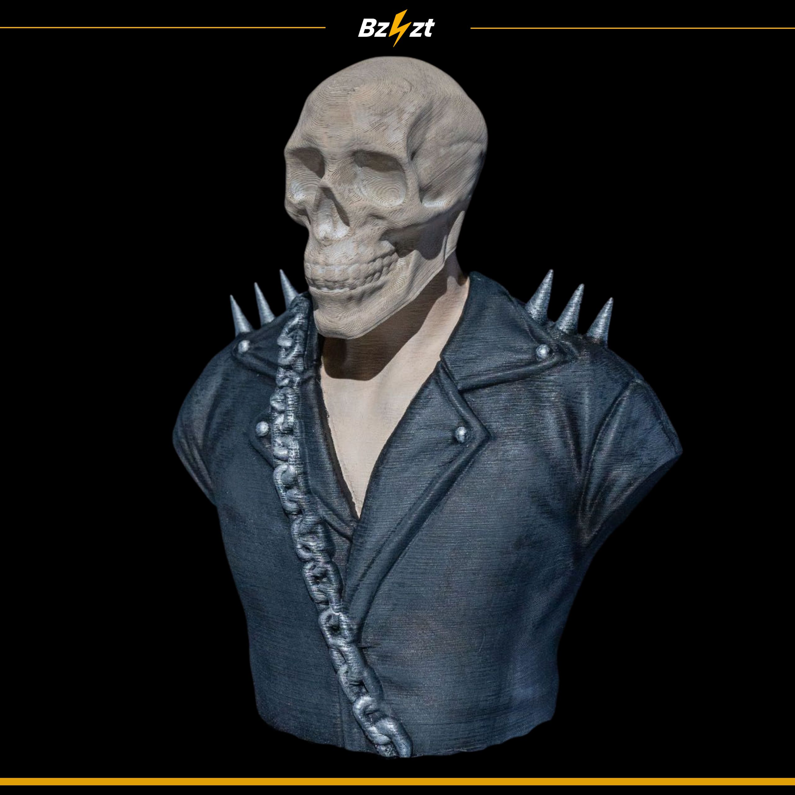 Figurka halloweenowa – czaszka w kurtce z kolcami i łańcuchem. Wymiary 75 × 124 × 160 mm. Dostępna w wersji białej (niemalowanej) i malowanej.