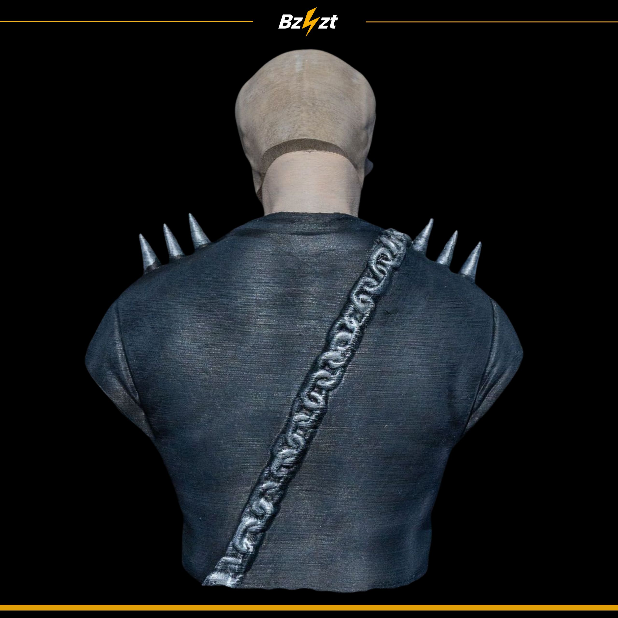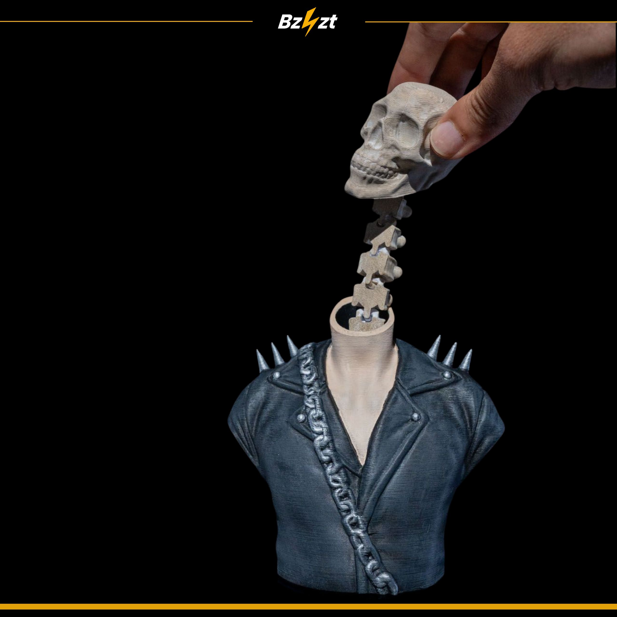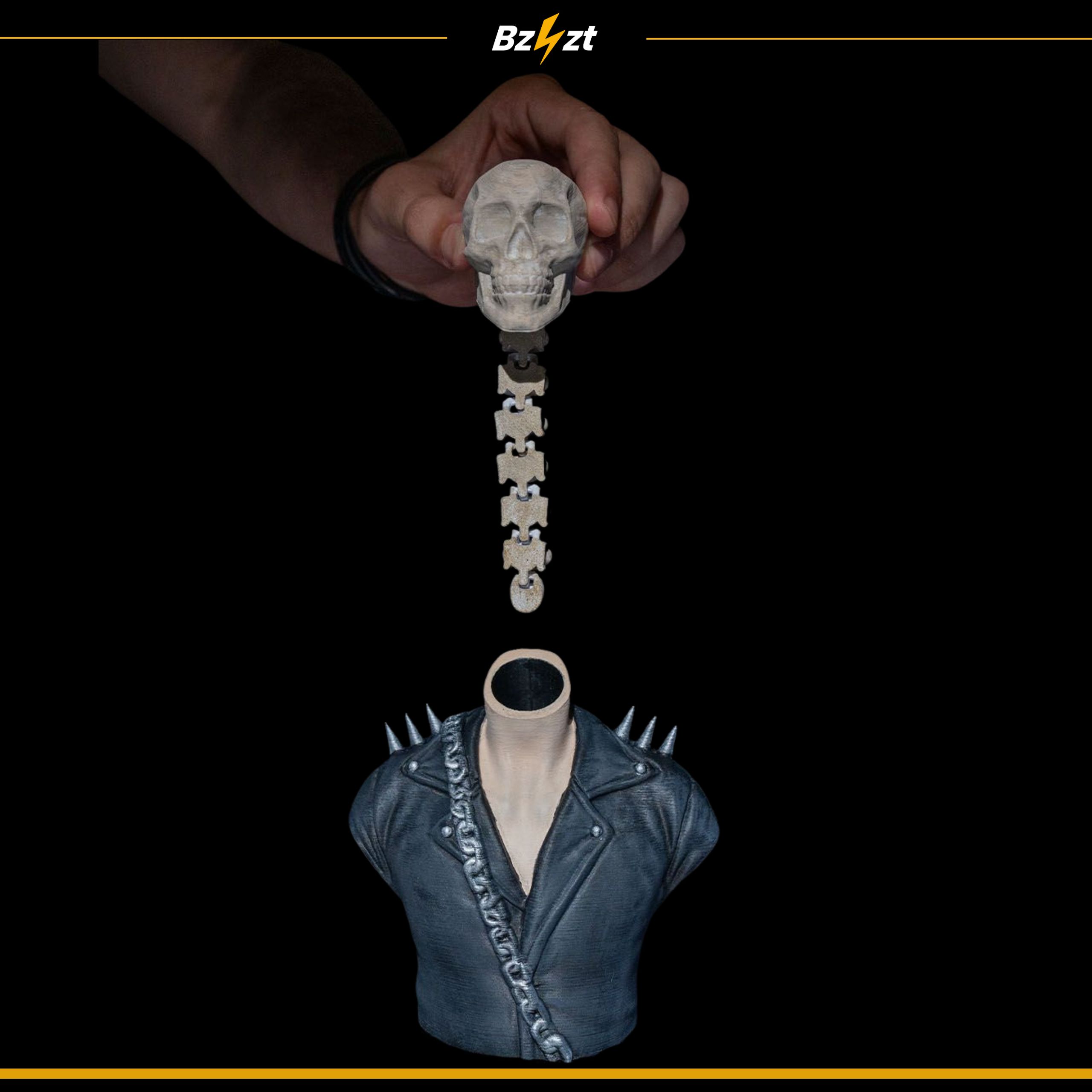 - Unikalny design – czaszka w kurtce z kolcami i łańcuchem.