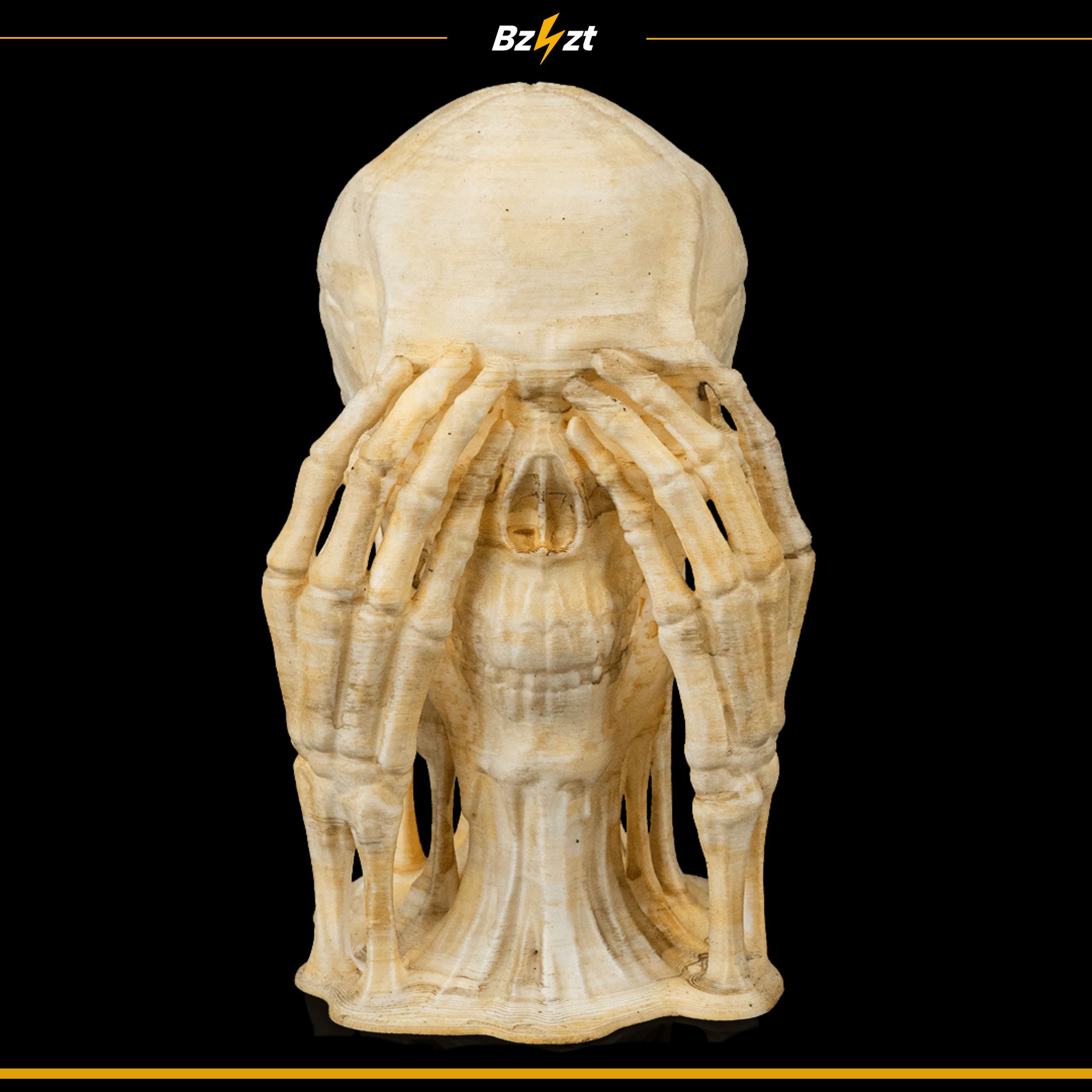 Wyjątkowa figurka halloweenowa przedstawiająca czaszkę trzymającą się za głowę i twarz – idealna ozdoba do wnętrz w klimacie grozy.