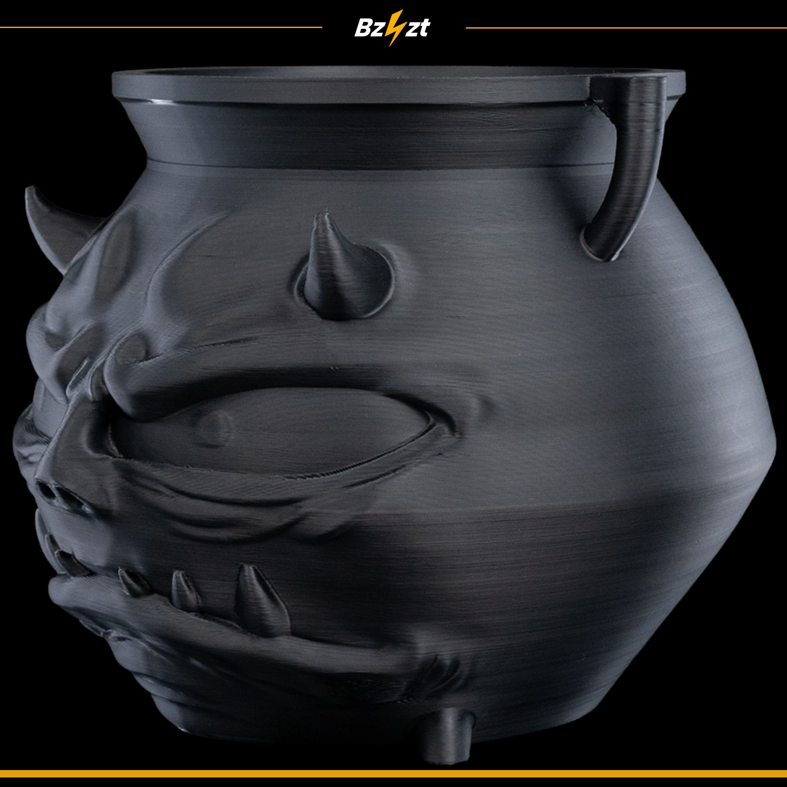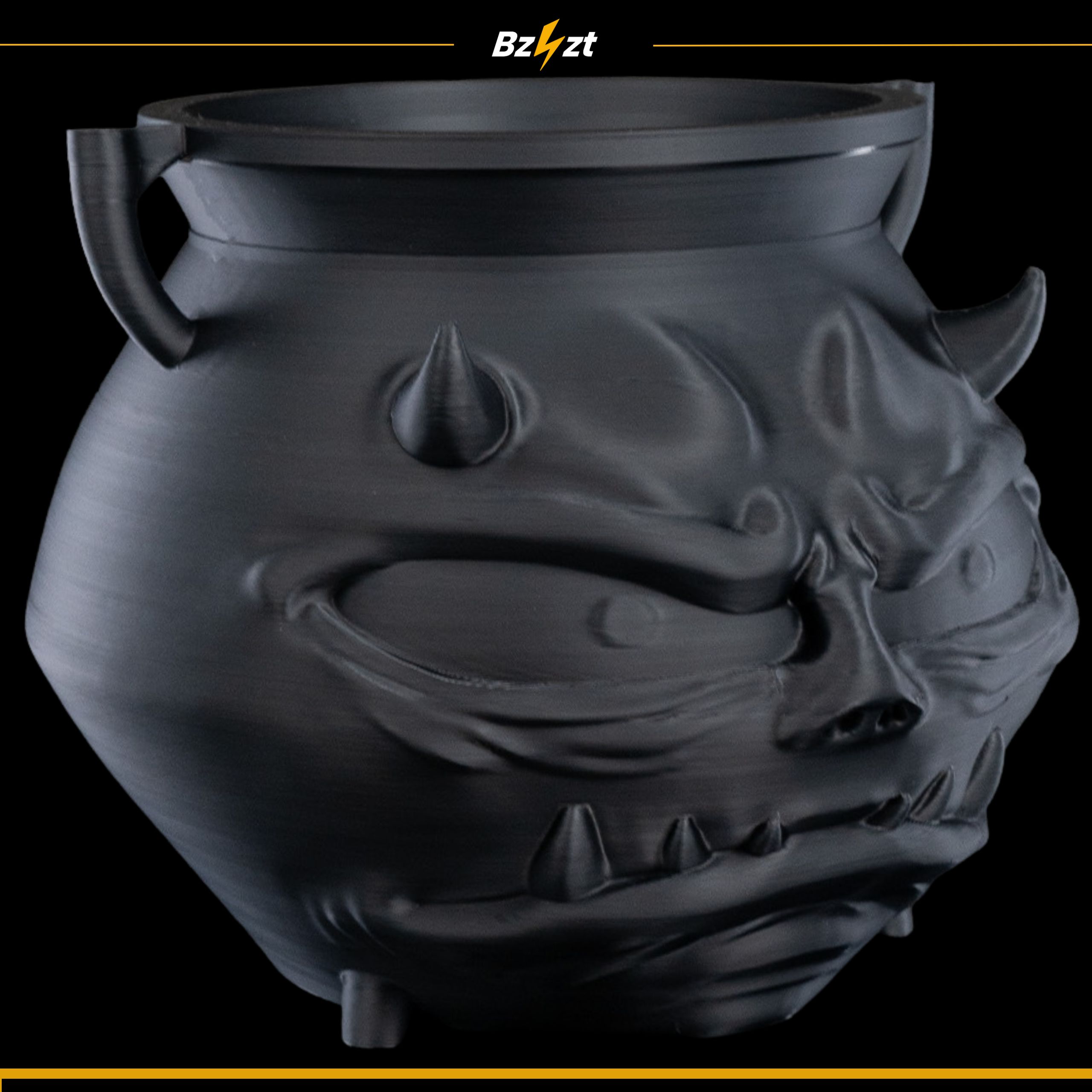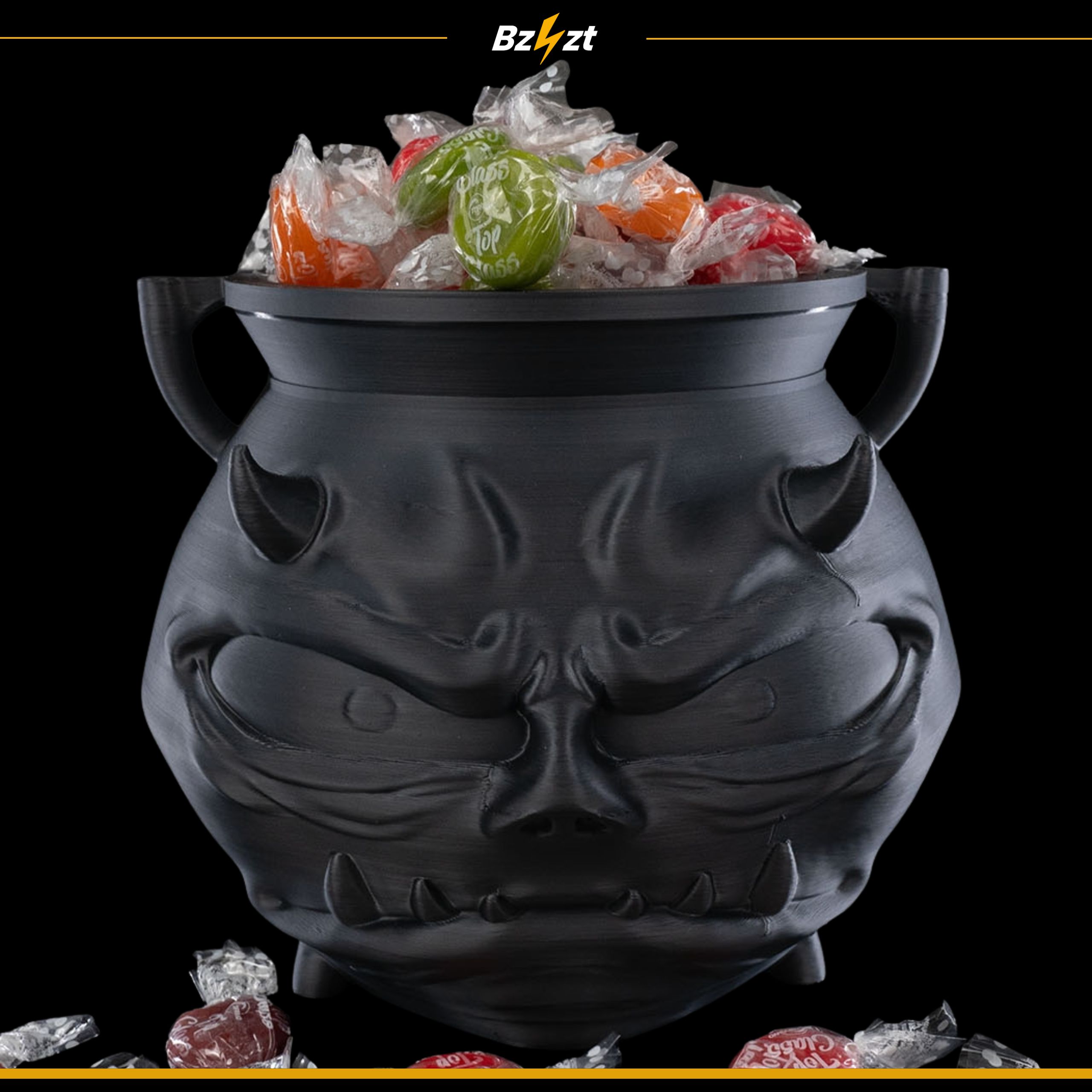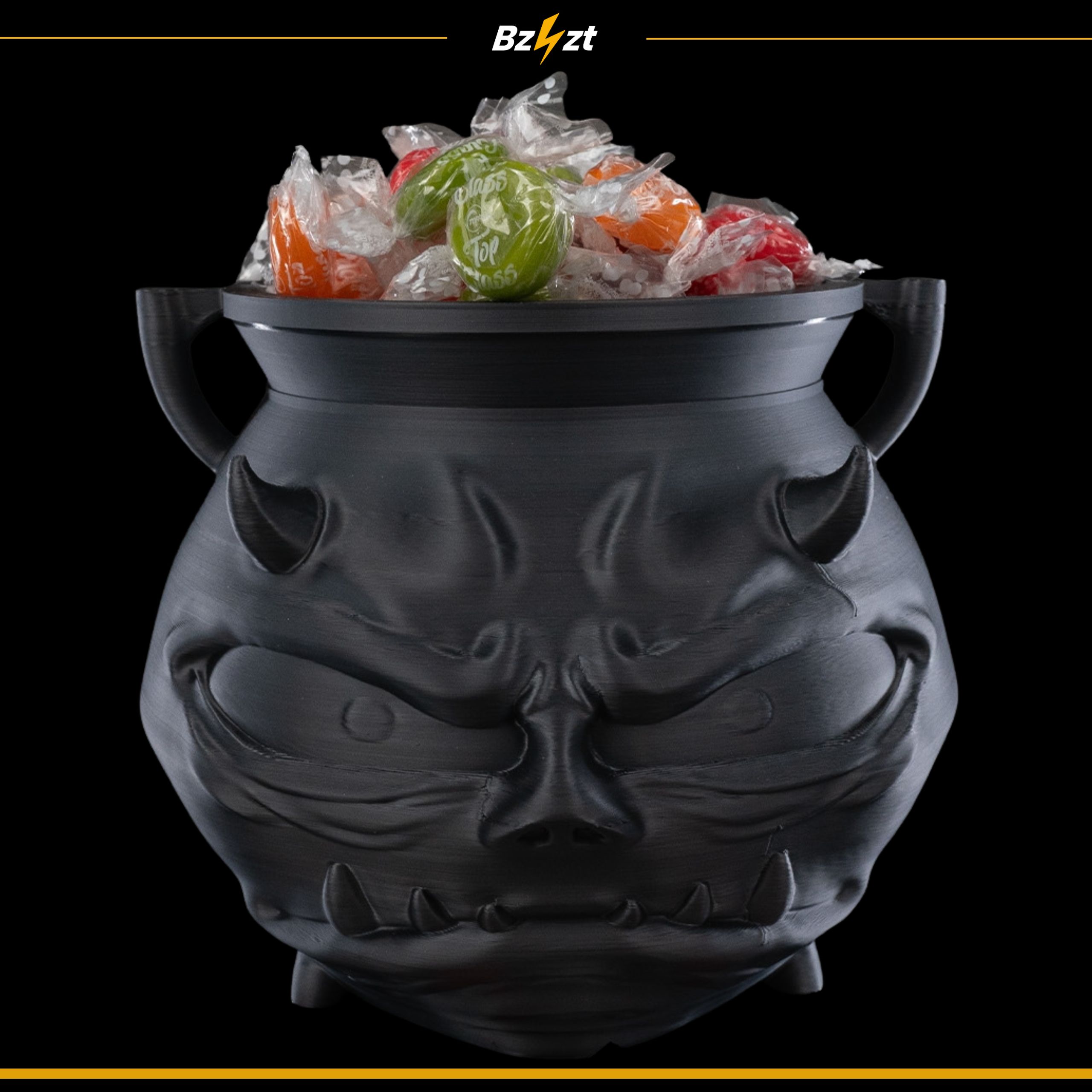 Kociołek halloweenowy 3D z rogami – klimatyczna dekoracja grozy i praktyczny pojemnik na cukierki. Wymiary 175 × 190 × 147 mm. Idealny na imprezy, ozdobę wnętrza lub dodatek do aranżacji tematycznych.