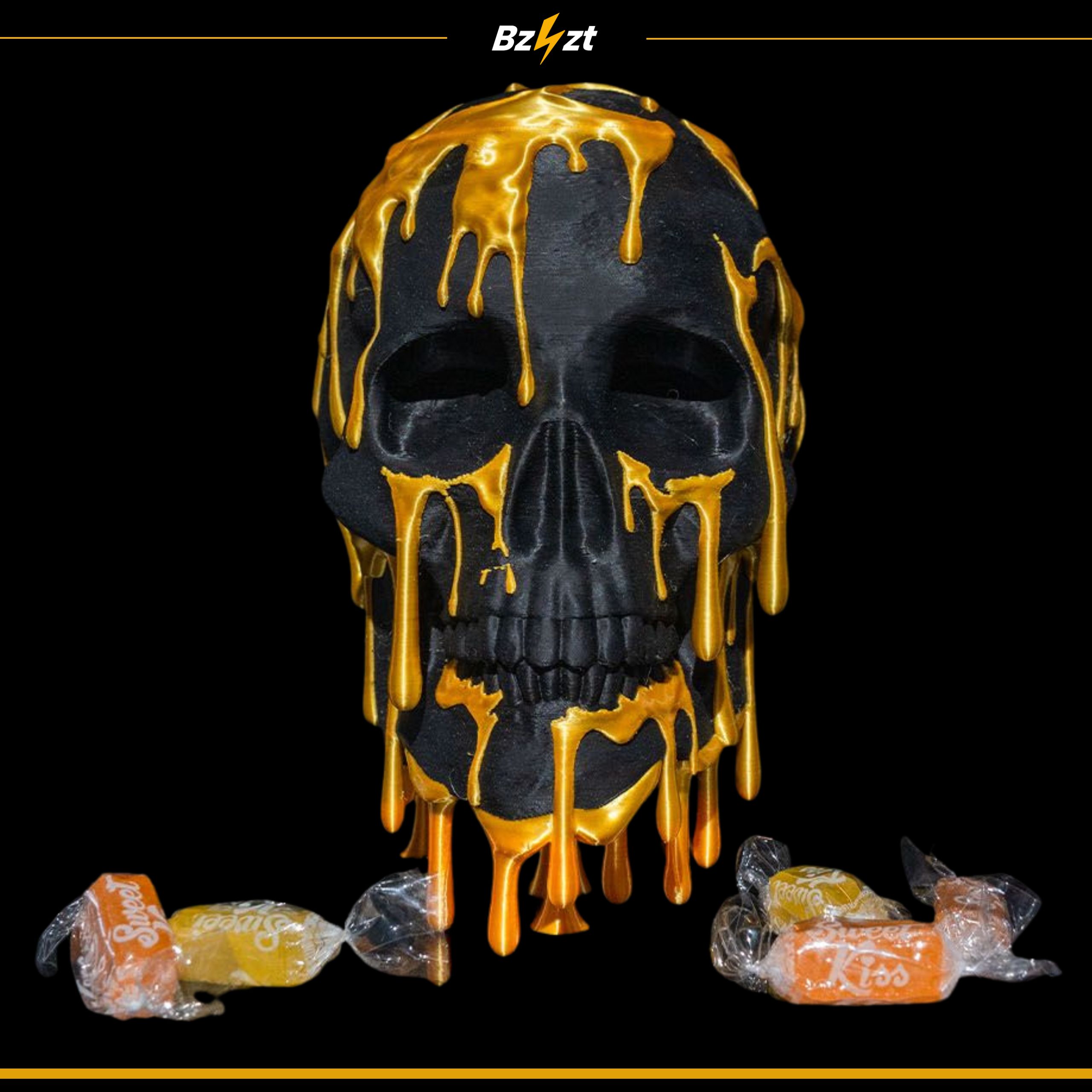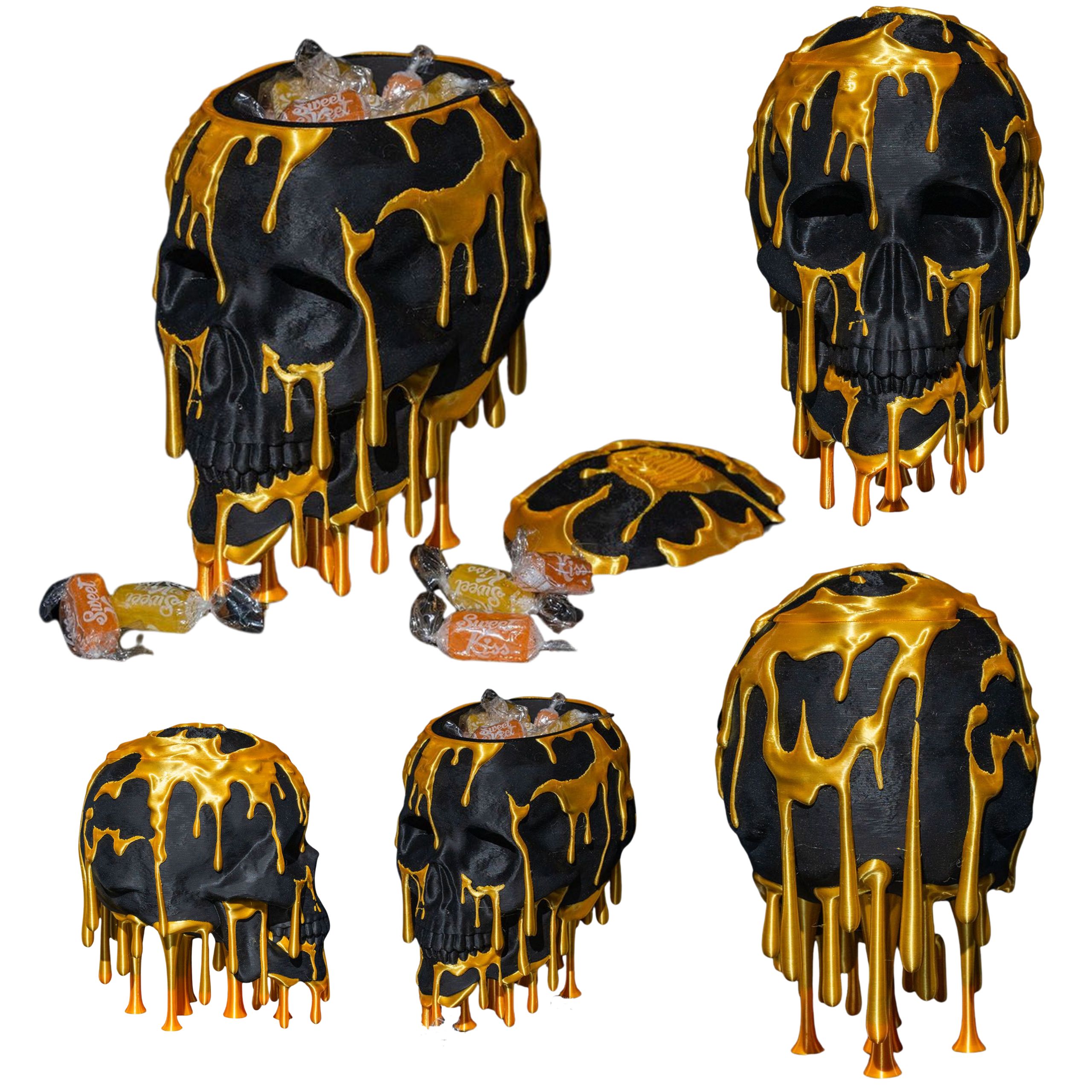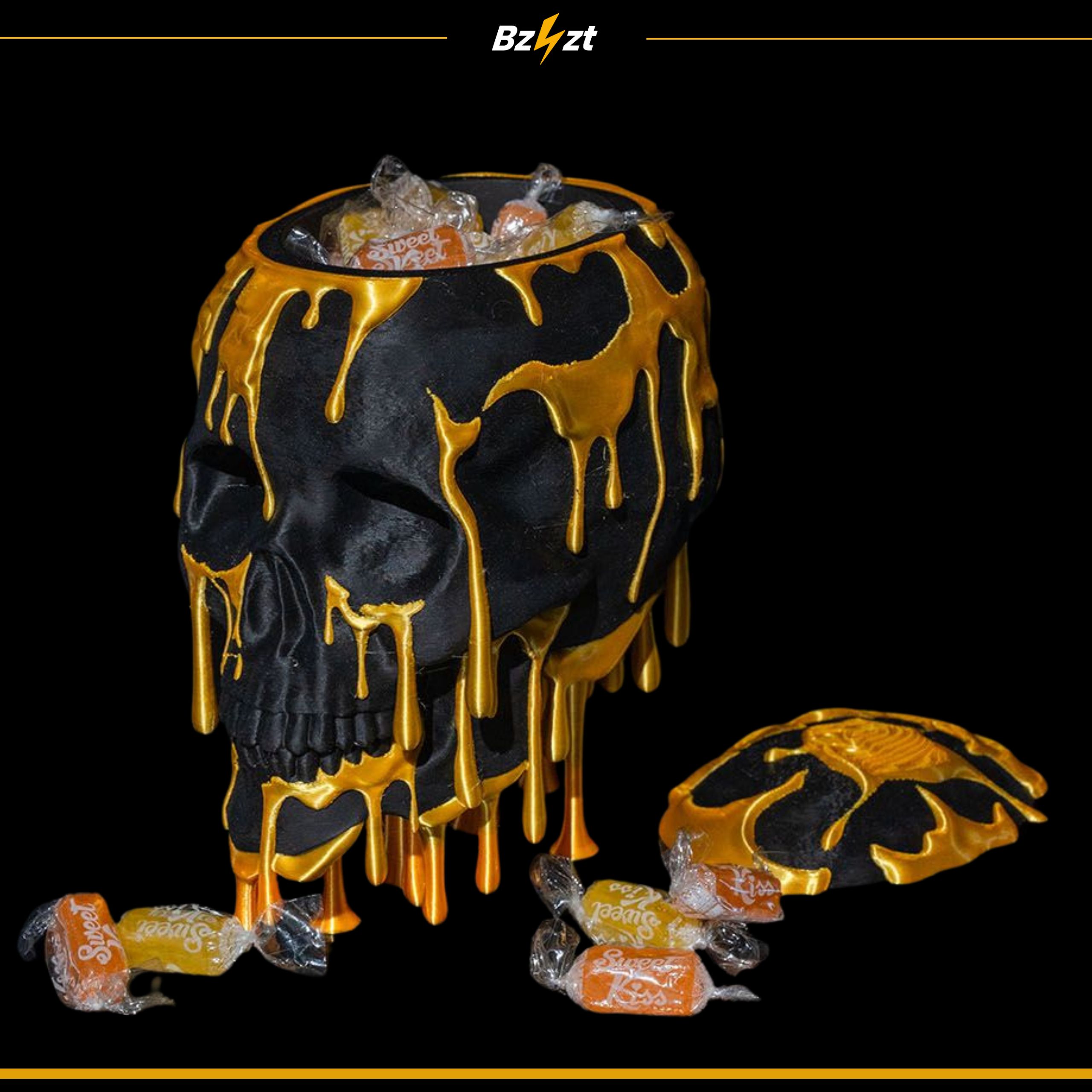 Halloweenowy pojemnik w kształcie czarnej czaszki ze złotymi zaciekami. Wymiary 113 × 146 × 170 mm. Dostępny w wersji czarnej (niemalowanej) i malowanej.