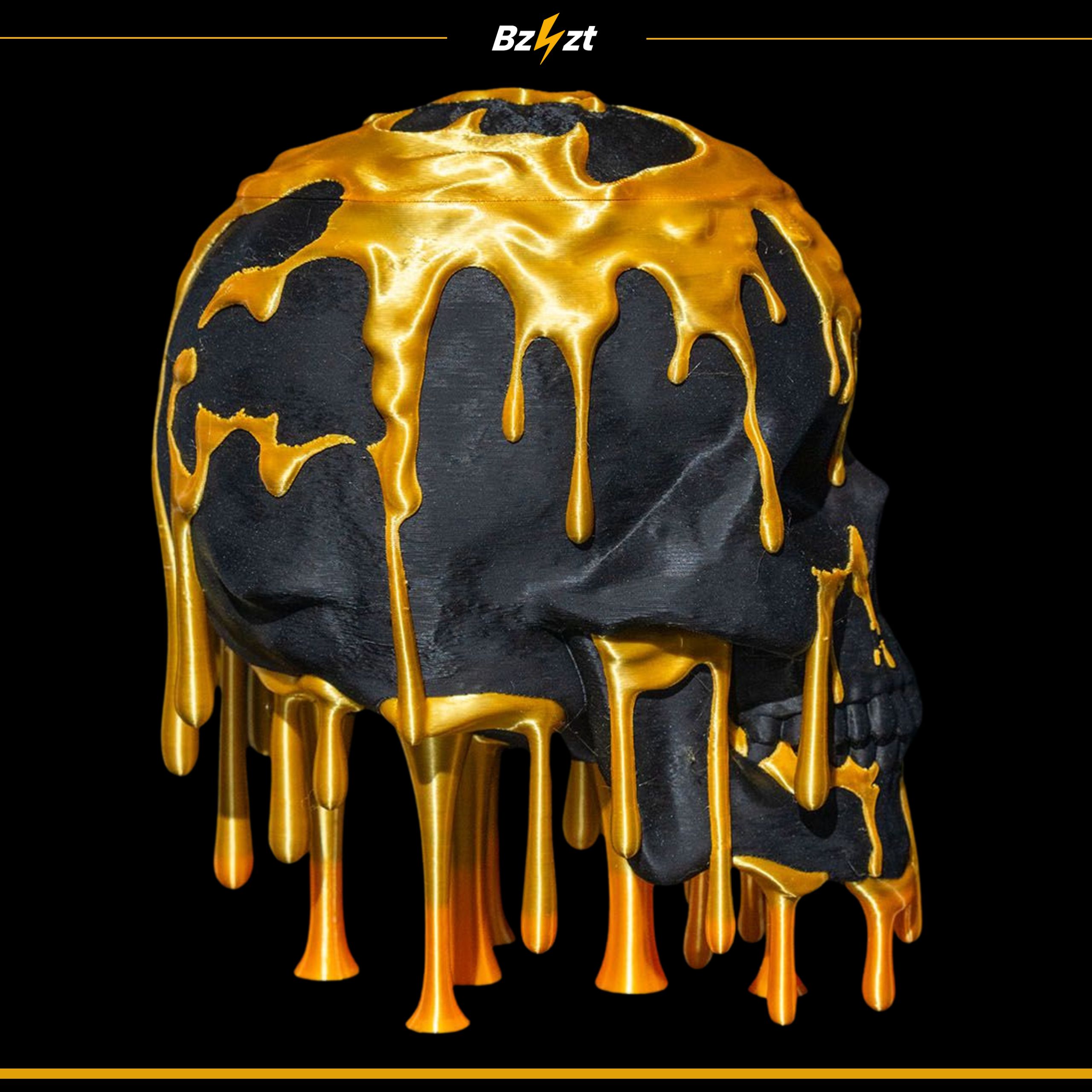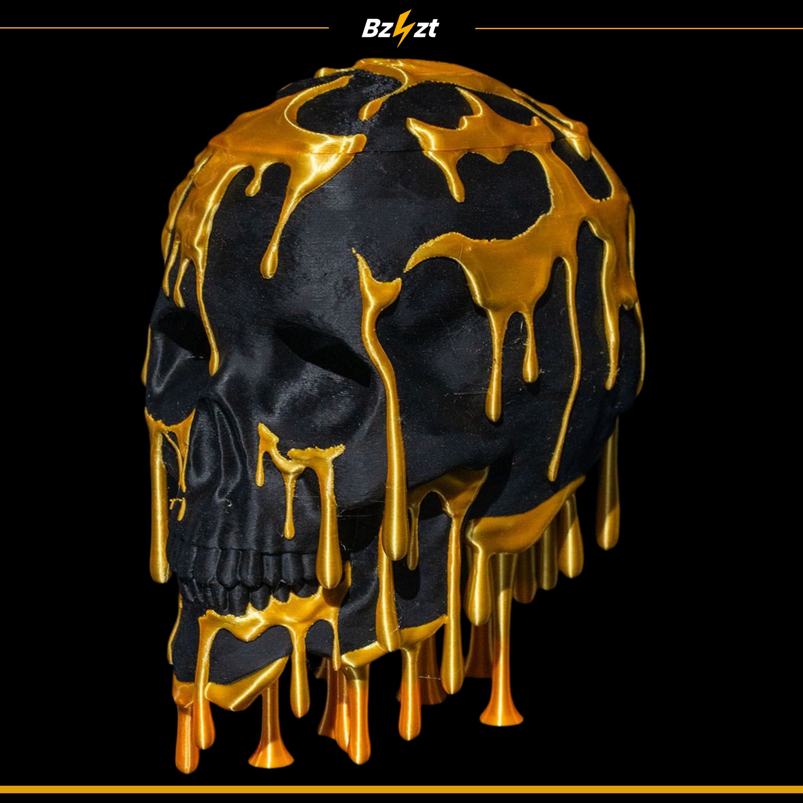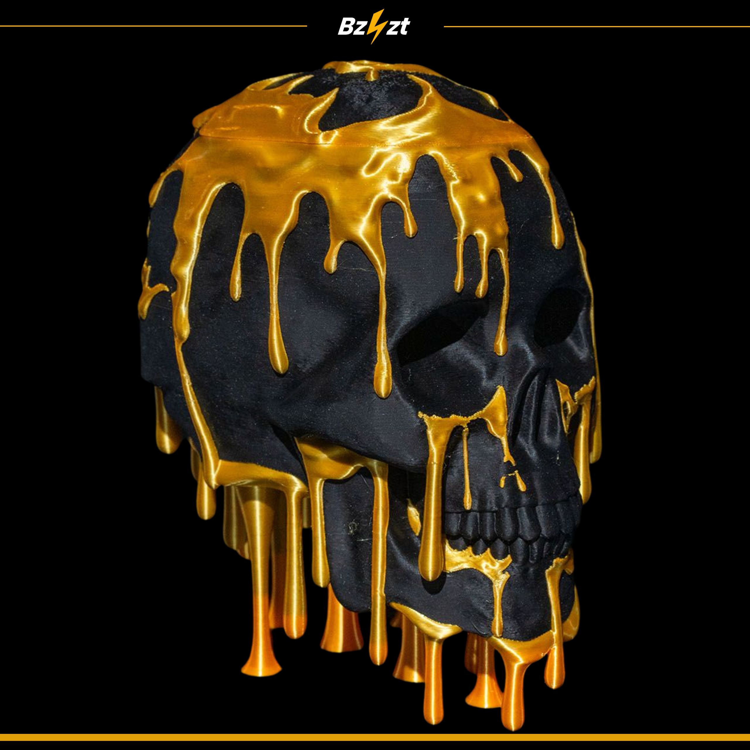 Halloweenowy pojemnik w kształcie czarnej czaszki ze złotymi zaciekami. Wymiary 113 × 146 × 170 mm. Dostępny w wersji czarnej (niemalowanej) i malowanej.