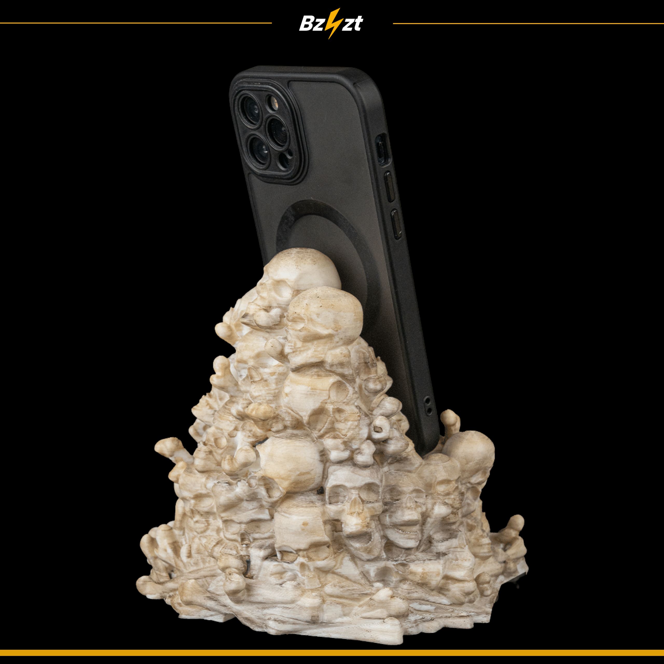 Wyjątkowy stojak na telefon w klimacie Halloween, wykonany z detalicznym motywem czaszek. To połączenie praktyczności i ozdoby – świetnie sprawdzi się na biurku, półce czy podczas imprezy tematycznej. Telefon przedstawiony na zdjęciu nie jest częścią zestawu.