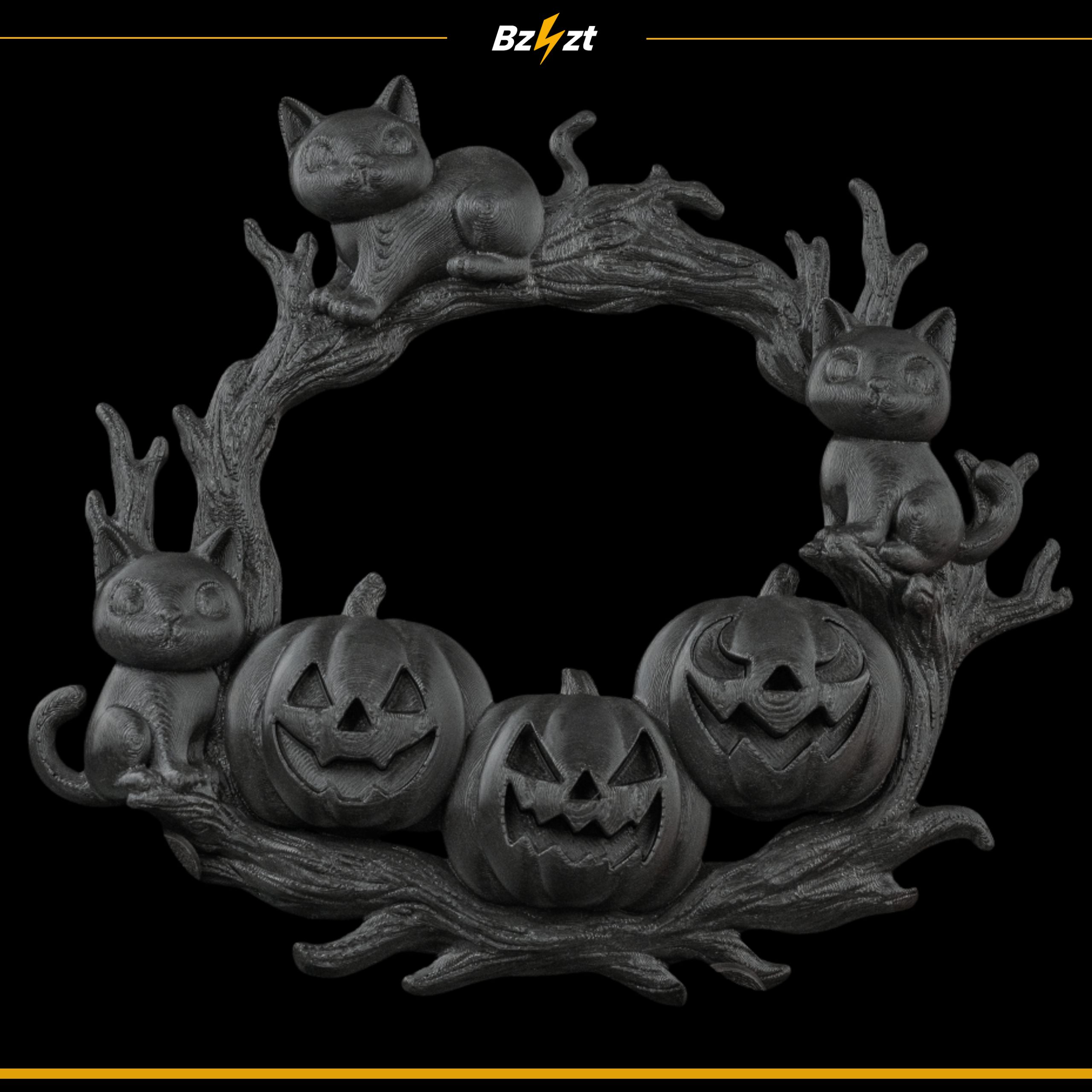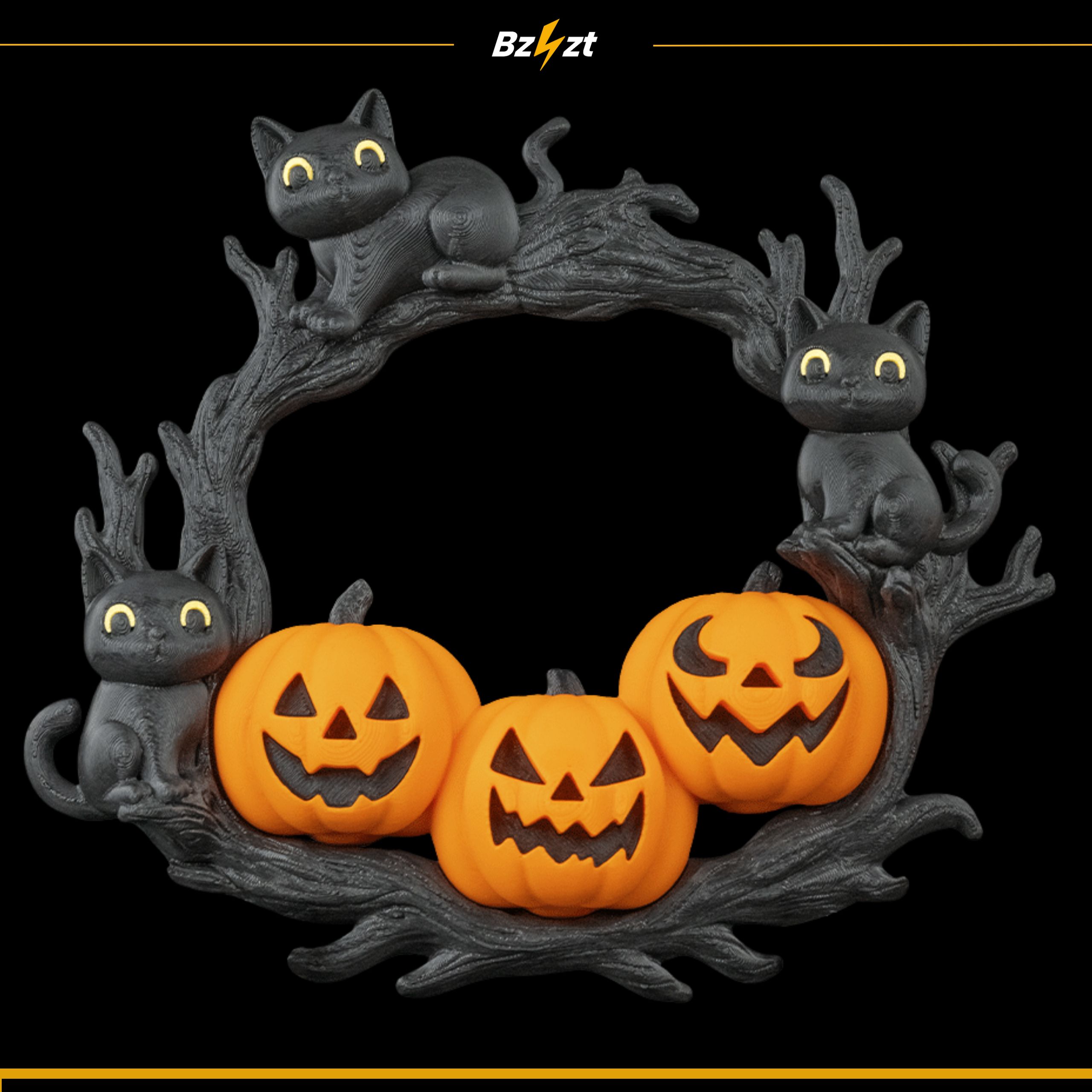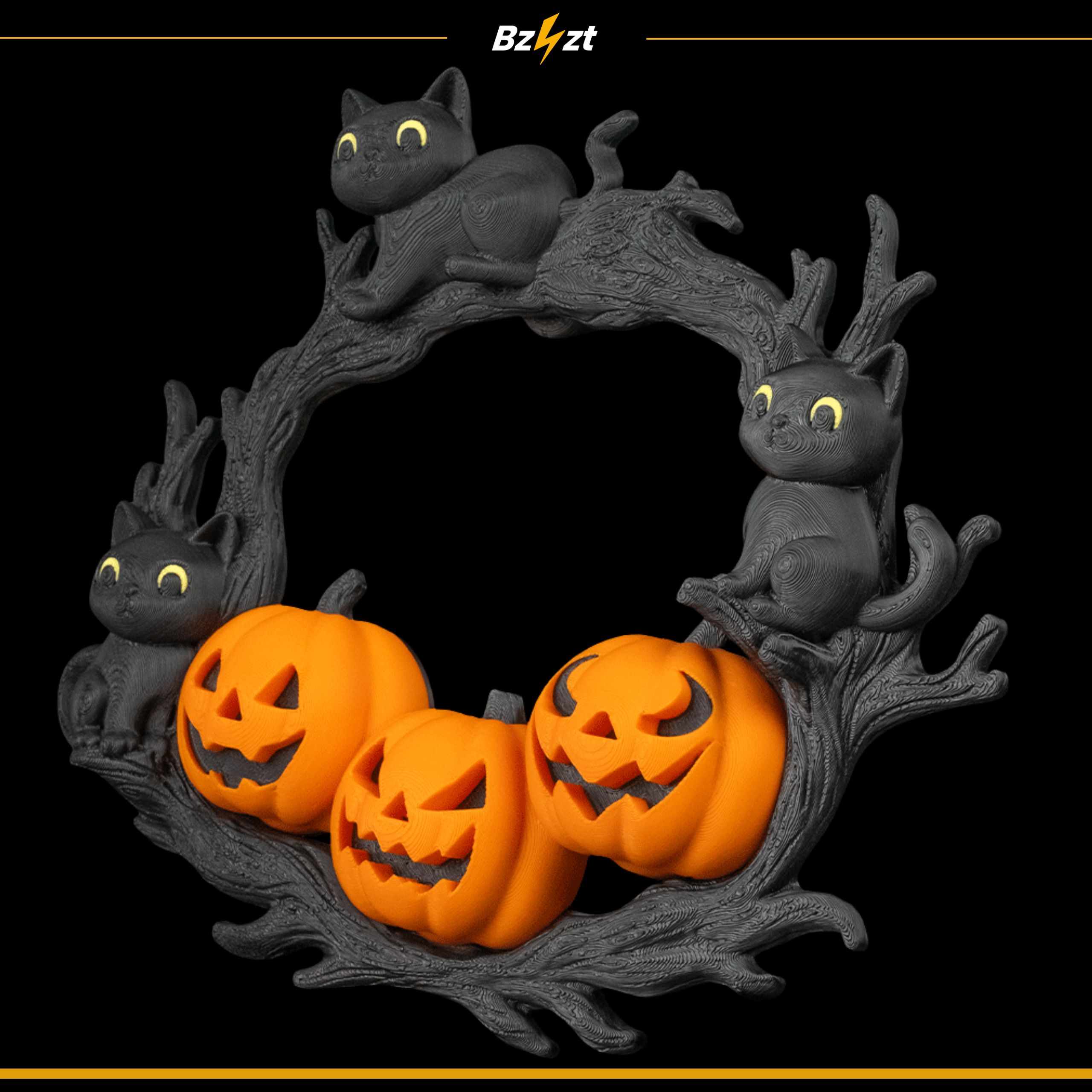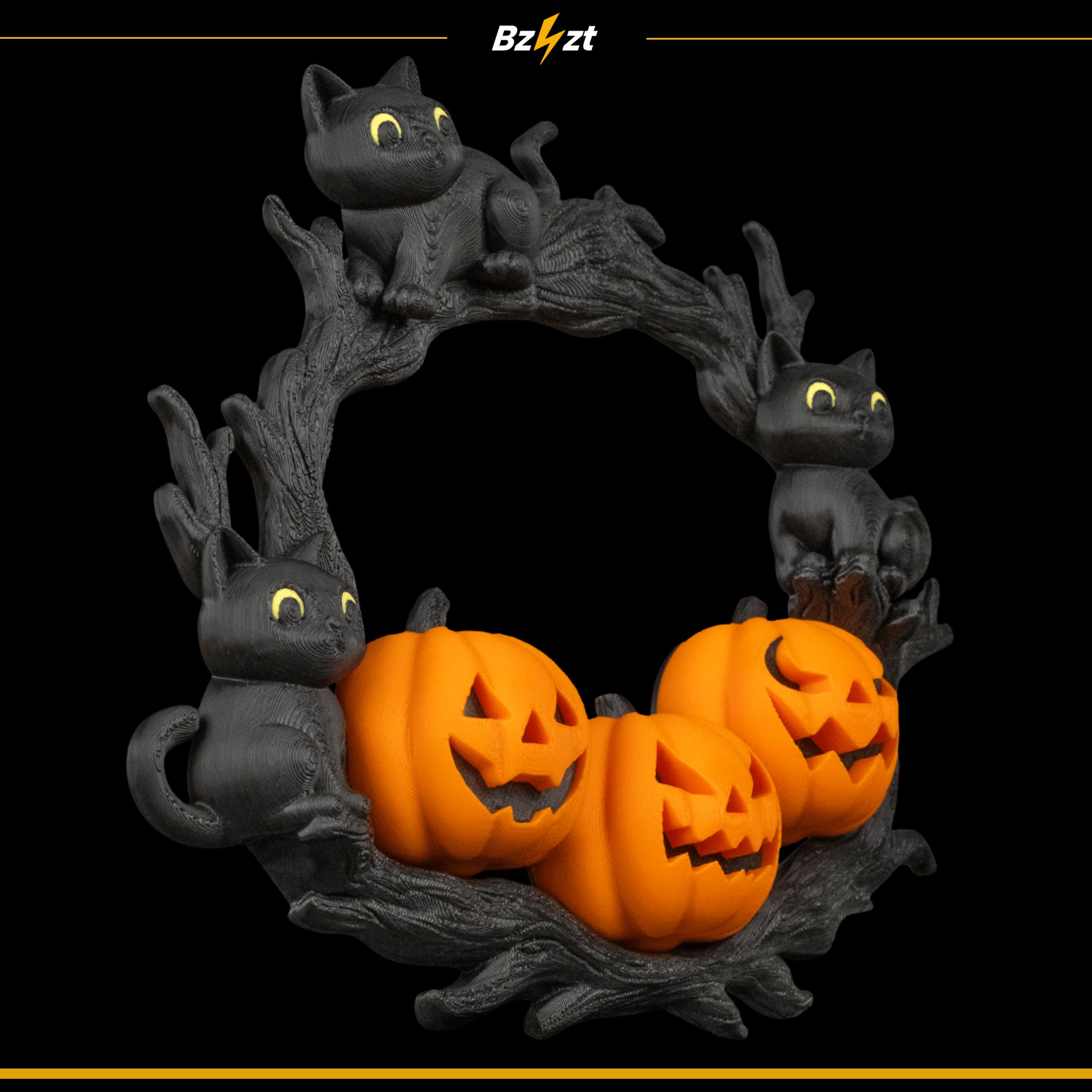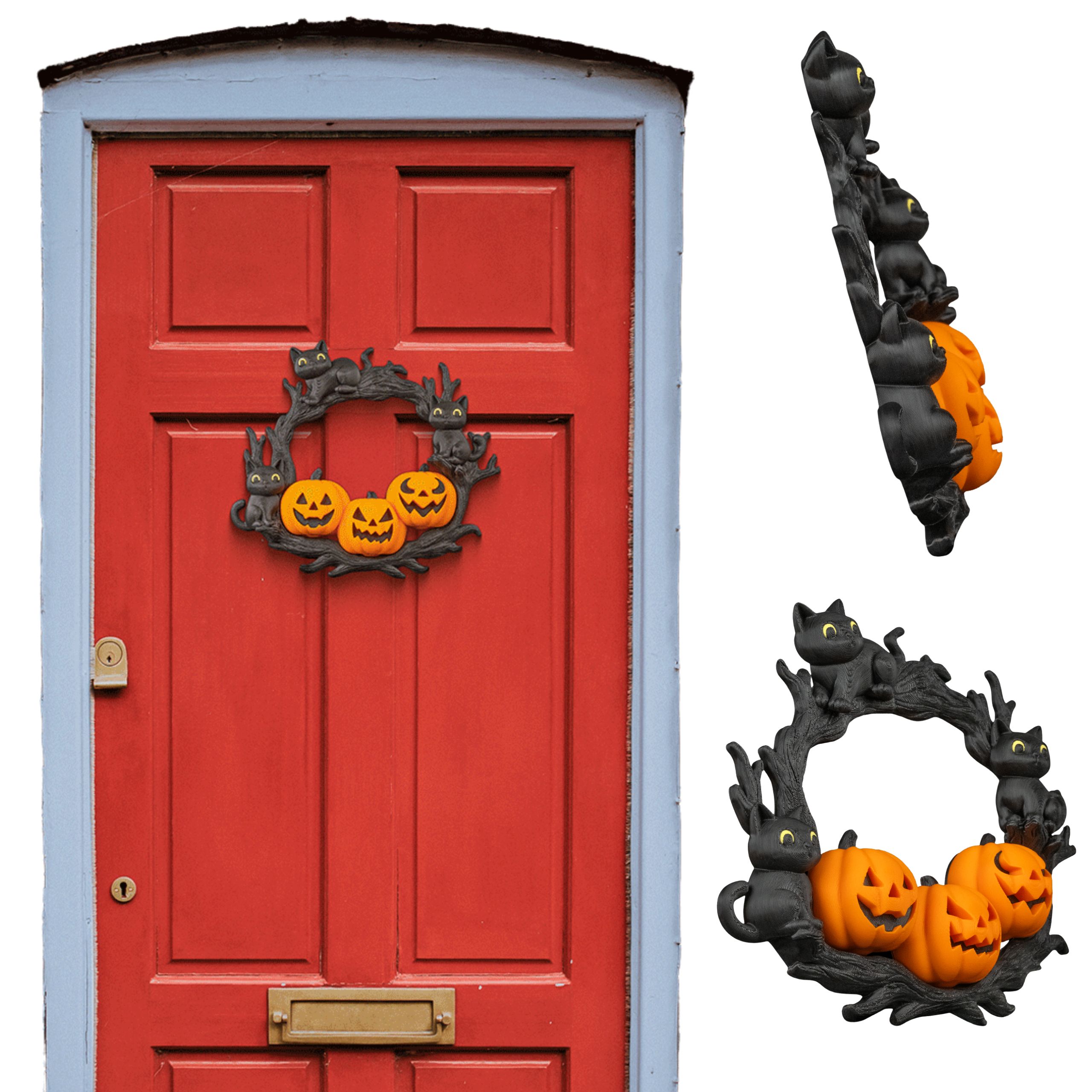 Efektowna dekoracja halloweenowa przedstawiająca trzy dynie i czarne koty siedzące na gałęziach. Idealna jako ozdoba drzwi, ściany czy okna – przyciąga wzrok i podkreśla klimat Halloween.